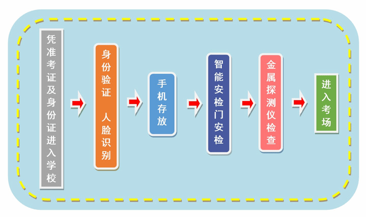5.按照要求,考生不得将手机带入考点考试封闭区域。所有考生进入考点后须将手机存放至统一指定地点,通过安检门安检后方能进入考试封闭区域。