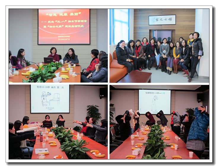 在第104个“三•八”国际劳动妇女节来临之际,为丰富女教职工业余文化生活,促进身心健康,展现继续教育学院女教职工的精神风貌,在学院领导的大力支持和工会的精心组织下,我院于3月7日下午举办了纪念“三•八”妇女节茶话会暨“妇女之家”建设启动仪式,学院全体女教职工在紧张繁琐的工作闲暇,共庆属于自己的节日。 茶话会上,陆李莉书记代表党政领导向姐妹们致以节日问候,并从健康、独立、自信、乐观、优雅、知性等方面与大家分享了对“好女人”的理解,同时为大家介绍了一套办公室健身操,伴着音乐女同胞们当场就学做了这套脊椎放松操。 工会女工委员杨颖丽介绍了学院 “妇女之家”建设的整体安排。她倡议各位女教职工充分发挥主人翁精神,展示女性的智慧与才干,凝聚女性的力量,参与到学院“妇女之家”的建设中。会上,就如何更完善地建设“妇女之家”听取了女教职工们的意见和建议。 茶话会后,陆书记带领工会成员走访慰问了坚守在工作岗位的女教职工们,感谢她们的辛勤付出和默默奉献,并向她们致以节日的问候。 通过此次活动,不仅增进了女教职工之间的了解,放松了身心,更使大家感受到学院领导的重视与关怀,增强了凝聚力,为今后学院工作的顺利开展发挥了积极作用。 继续教育学院工会 2014年3月10日