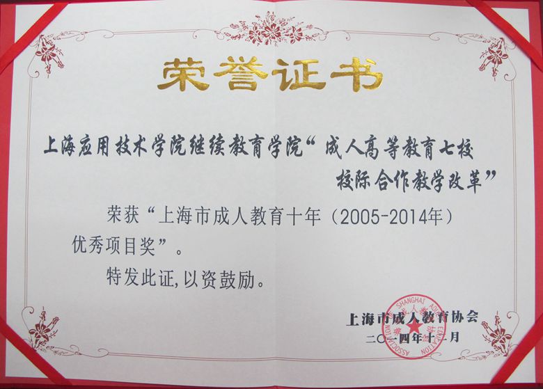 “成人高等教育七校校际合作教学改革”项目荣获“上海市成人教育十年(2005-2014年)优秀项目奖”。