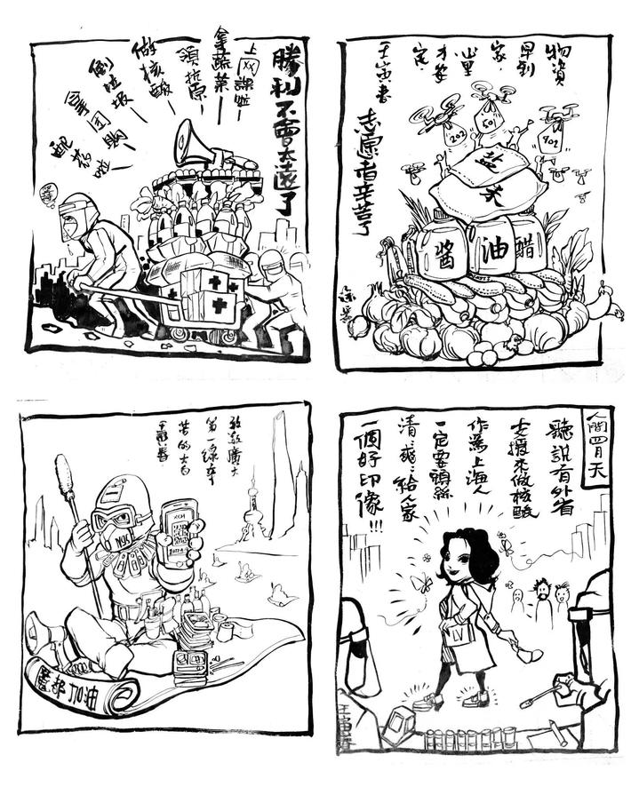 作品理念:用笔墨描绘全国人民齐心协力援助上海人民的画面,记载着激动感人、鼓舞人心的上海人们幽默顽强的抗疫精神。用自己小小力量,同心抗疫,鼓舞斗志,抚慰心声,为守“沪”,抗疫必胜贡献自己的一点微光。