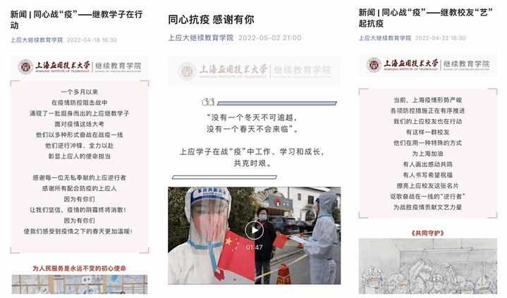 依托学院微信公众平台,学院推出“同心战‘疫’”继教学子抗“疫”在行动系列报道,剪辑制作继教学子抗疫风采宣传片《同心抗疫 感谢有你》,展现了抗议期间继教学子热爱生活、积极向上的精神风貌,引导学生从战“疫”中汲取前行的精神力量。