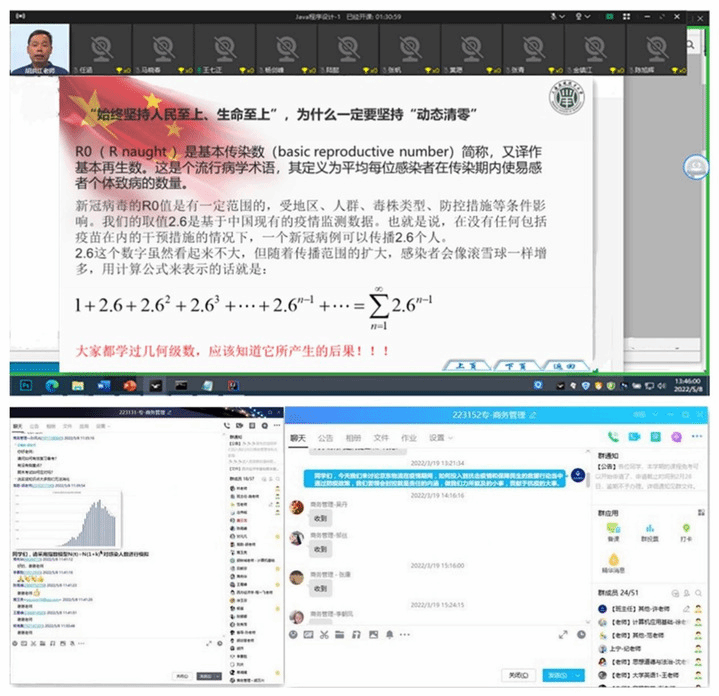 教育部课程思政教学名师胡洪江老师在“高等数学”课堂上,利用数学中的传染病模型、人口流动预测模型,以及交通物流和抗疫物资调配优化等与疫情相关的现实问题,引导学生用数学知识解决实际问题,还带领学生交流讨论,构建融入疫情中的数学建模,增强学生们刻苦钻研的科学精神和战胜疫情的坚定信心。课堂上,这样的教师还有很多,他们结合自身专业特长和生活经历,将党中央的疫情防控方针、政策、措施和在抗击疫情中涌现的感人故事转化为生动、鲜活的教学内容,引导学生深刻、完整、全面认识党中央确定的疫情防控方针、政策,并勇担社会责任。