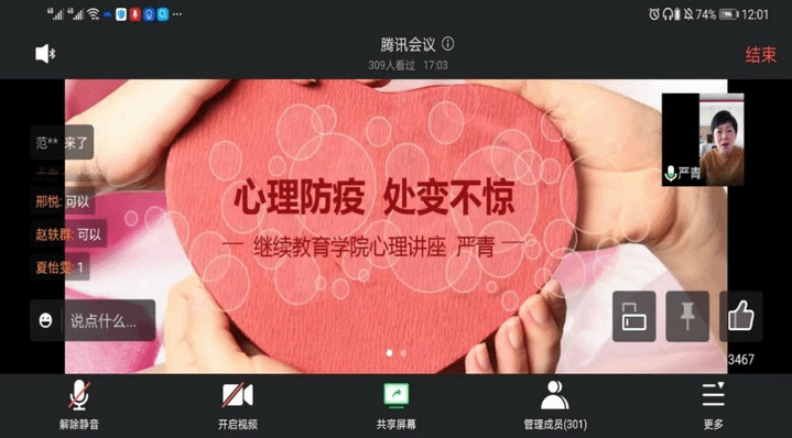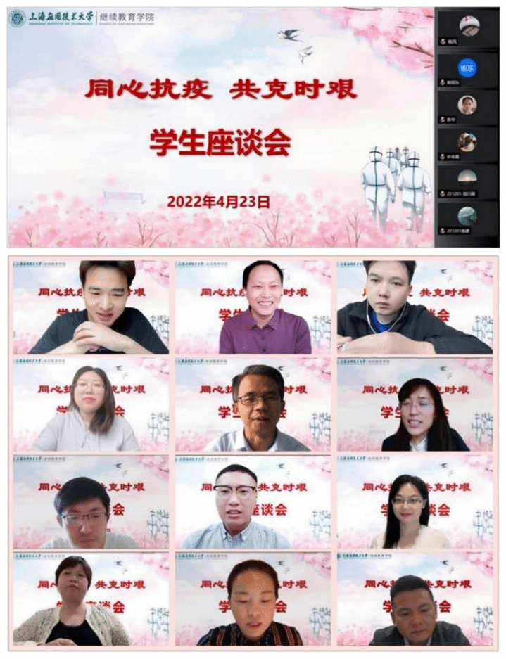 为缓解学生的心理压力,学院举办了以“心理防疫 处变不惊”为主题的心理讲座,帮助学生在新冠疫情期间学会情绪管理,增强心理弹性,提高自身心里的抗压能力和心理免疫力,讲座吸引了近400名师生参与,点赞量高达6.1万;召开了“同心抗疫 共克时艰”学生座谈会,邀请学生代表分享作为方舱建设者和社区志愿者的所见、所闻、所思、所感,引导广大继教学子理解支持抗疫工作,提升个人防护意识,鼓舞和带动学生积极调整心态,增强在线学习、科学防疫的信心。
