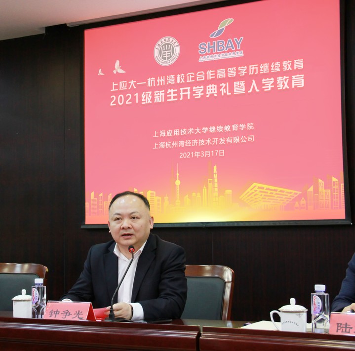 3月17日下午,上应大-杭州湾校企合作高等学历继续教育2021级新生开学典礼暨入学教育,在美丽的奉贤海湾隆重举行。上海应用技术大学继续教育学院领导出席典礼,上海杭州湾经济技术开发有限公司党委副书记、总经理钟争光,副总经理陆纪红,总规划师顾春霞,安环部部长詹磊,企业代表以及2021级全体新生共同参加了此次开学典礼。典礼由上海应用技术大学继续教育学院直属党支部书记毕劲松主持。