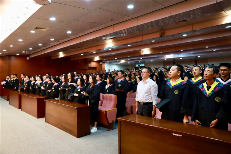 在欢快的音乐声中,各位领导共同为学位获得者代表正冠拨穗,颁发学位证书。毕业典礼在全场激昂的《毕业歌》大合唱中圆满落幕。