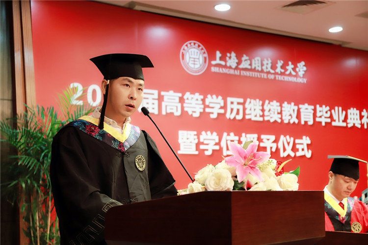 张锁怀代表学校向全体毕业生表示祝贺,向辛勤付出的老师致以敬意!他肯定了毕业生在工学矛盾的压力下,仍坚持不懈求学深造的毅力和决心,并为同学们今天所取得的收获感到骄傲。他勉励毕业生要追求与时代同脉的高远理想,以民族复兴为己任,以国家呼唤为己任,以社会需要为己任;提升与时代同行的能力本领,继承和发扬“砥砺知行、厚德精技”的“上应精神”;谨记“明德、明学、明事”的校训,燃烧与时代同创的奋斗激情。