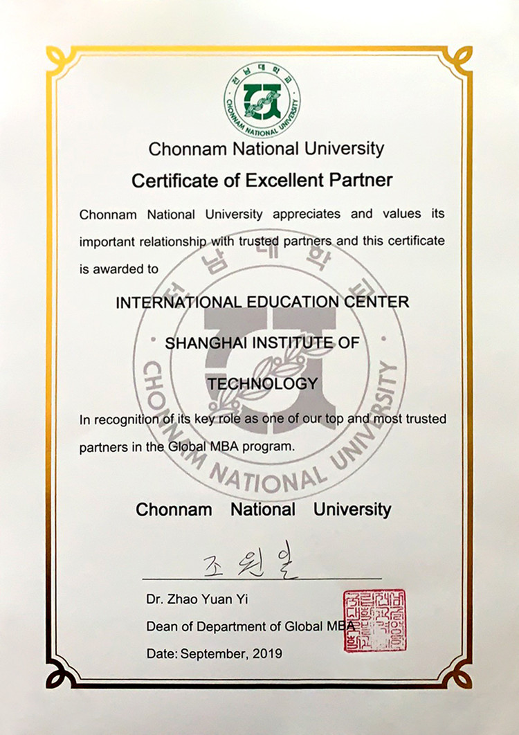 我校国际教育中心以优质的生源和出色的管理,得到了韩国国立全南大学的充分肯定和认可,荣获韩国国立全南大学中文MBA硕士留学项目“全球MBA优秀合作伙伴”称号并获颁证书。