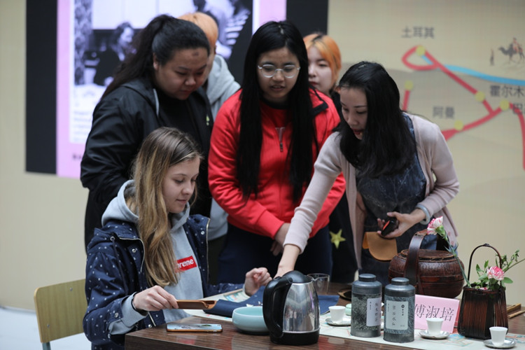 傅淑培老师以茶为媒,讲述了茶叶在中国与“一带一路”国家和地区经贸往来中的传播历史,突出了中国优秀传统文化在丝绸之路的文化引领作用。傅老师现场向中外学生展示了精湛的茶艺,并邀请学生现场体验,引导学生感受茶文化的博大精深,展示中国茶文化魅力,博得了学生阵阵掌声。