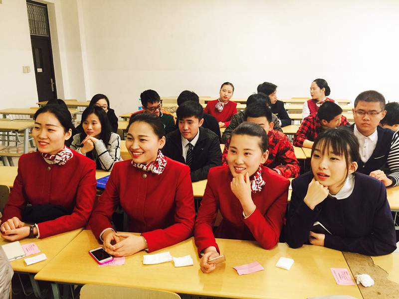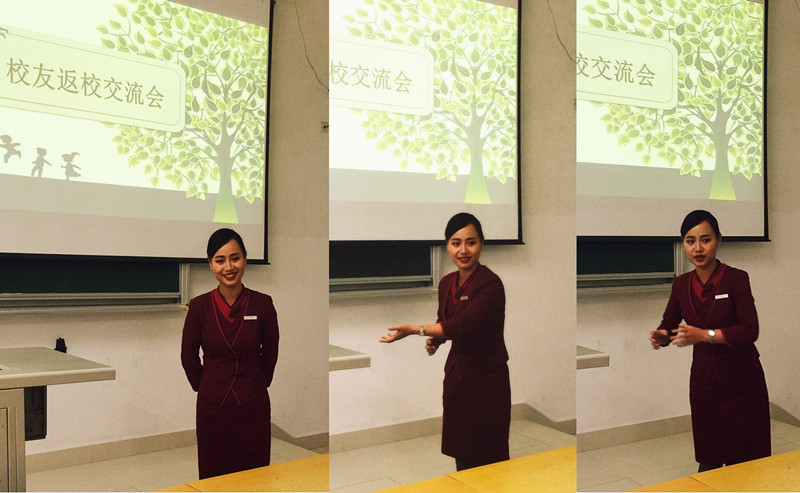 孙炯从继续教育的理念出发,娓娓道来对终身学习的认识和市“十佳”评选的心路历程;周丽娟从职业精神出发,分享了作为一名优秀空乘应具备的专业素养和现代服务意识,并现场示范了一套优雅的空乘服务规范动作;吴俊作为高铁培训经理,讲述了高铁发展的机会,动员同学们尽早做好职业规划。校友们的分享为学弟学妹们端正学习态度,树立职业理想起到了良好的示范作用。