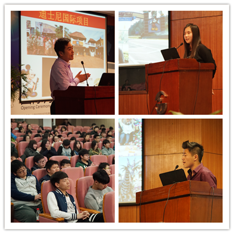 2016年3月16日晚6时,一场别开生面的讲座在图文信息楼116举行。三位曾赴美国参加迪士尼总部奥兰多带薪实习项目的同学声情并茂地为学弟学妹们分享了实习见闻和迪士尼的企业文化。讲座吸引了国际教育、航空服务教育以及艺术学院的同学参加。上海应用技术学院继续教育学院院长顾问、国际教育中心学术总监朱士昌教授、学院学生工作负责人管钰老师及国际教育中心领导也出席了此次讲座。