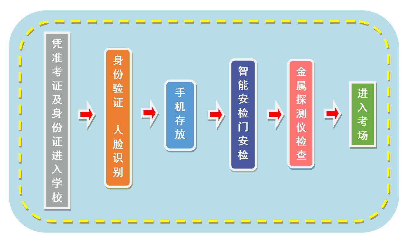 5. 按照要求,考生不得将手机带入考点考试封闭区域。所有考生进入考点后须将手机存放至统一指定地点,通过安检门安检后方能进入考试封闭区域。