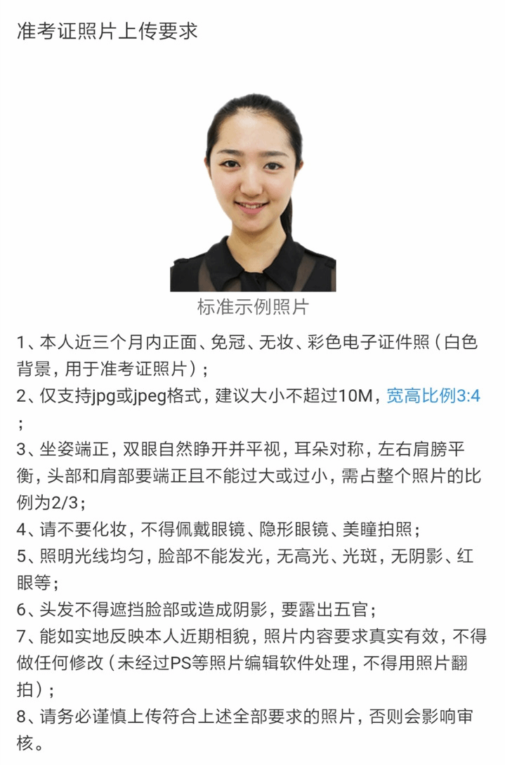 1.本人近三月内正面、免冠、无妆、彩色电子证件照(白色背景),照片要求见下图