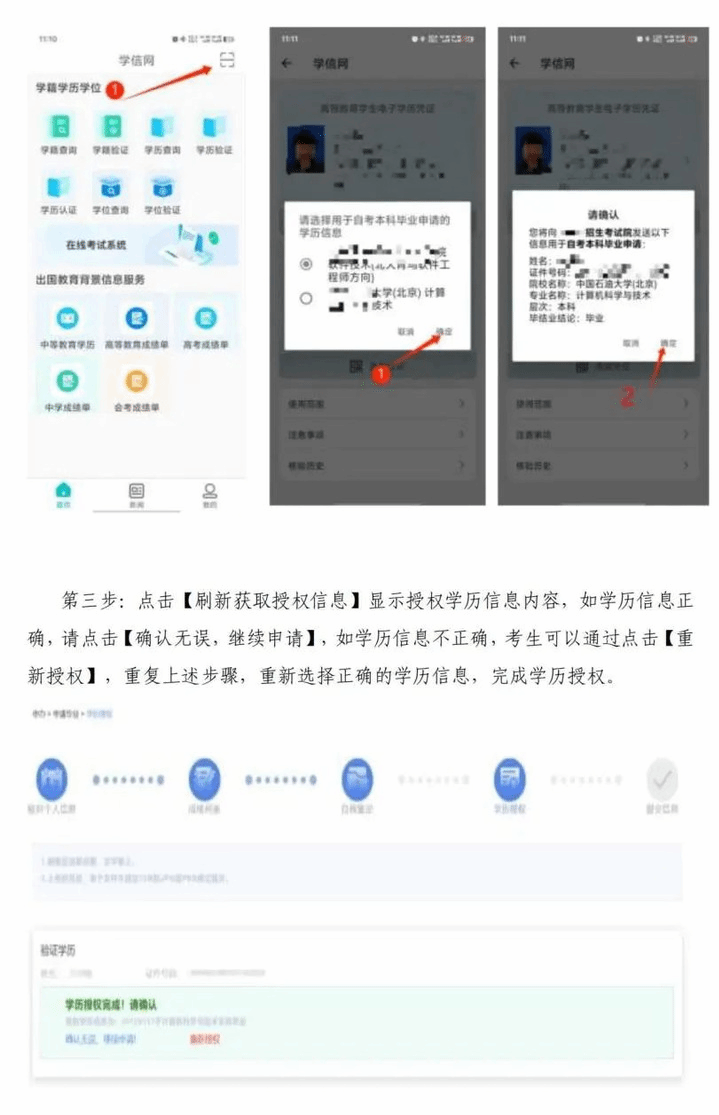 申请本科毕业的考生须安装并登录学信网APP,在“考生服务平台”进行“验证学历”授权,以便对考生前置学历进行自动验证,授权操作流程如下。