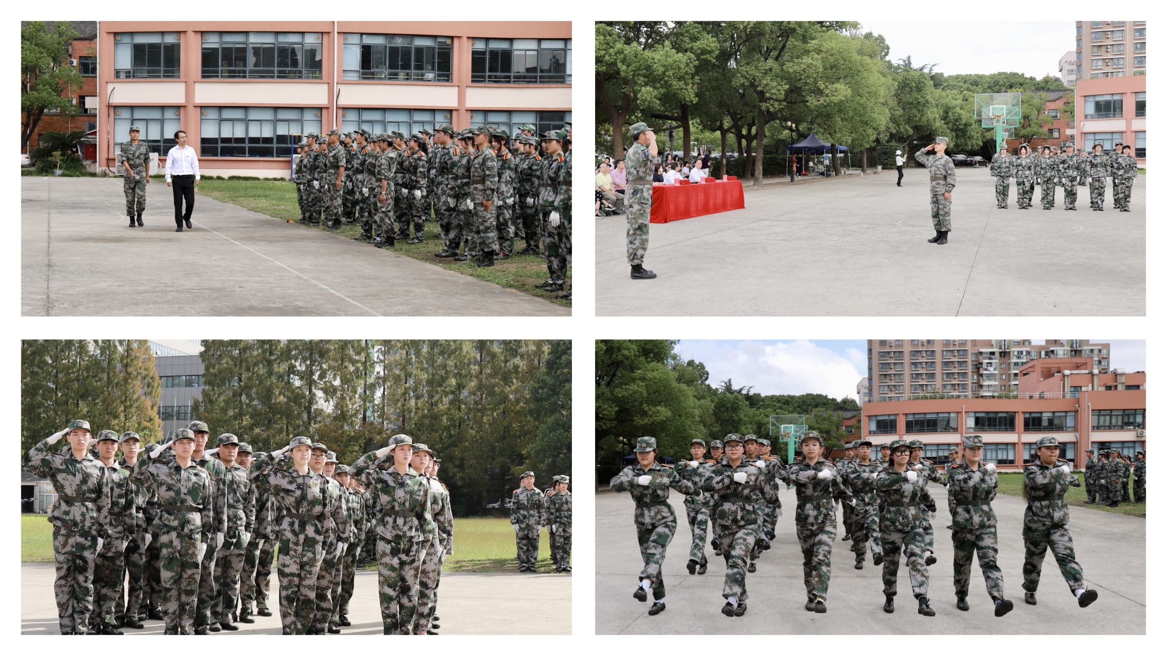 军训会操在雄壮的国歌声中拉开帷幕。毕劲松在总教官赵世明的陪同下,检阅了学生方阵。随后,各学生方阵在教官的指挥下依次进行了会操表演。立正、稍息、跨立、停止间转法、齐正步走、敬礼等基本动作不停转换,同学们军容严整、精神抖擞,展示了斗志昂扬的青春风采。