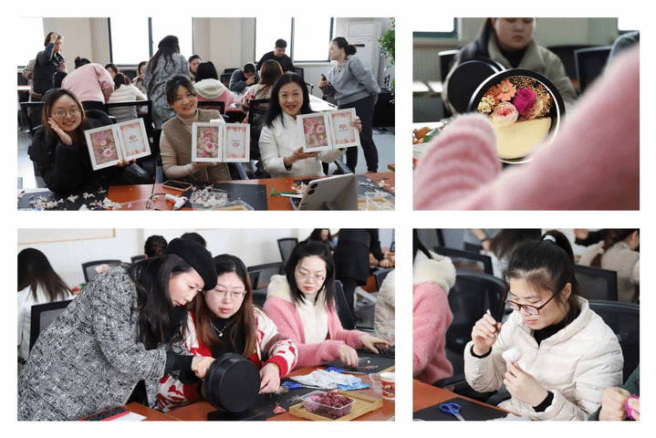 活动现场分为创意花盒、皮具卡套两个小组。女教职工们根据各自喜好挑选心仪的手工素材并加入相应的小组