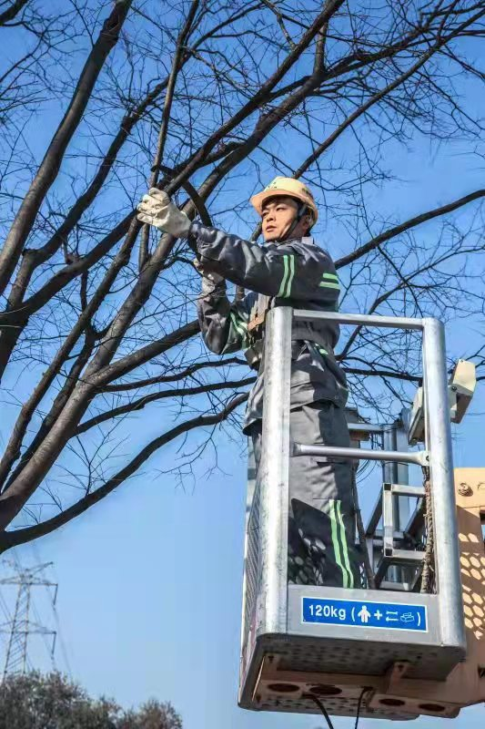 杨飞飞所在的行道树养护队被人们称作“城市理发师”。他从事行道树养管工作15年以来,带领着40余名队员每天穿梭在大街小巷,一年中有200多天的时间,“游走”在离地5-6米高的树枝间,完成行道树夏季剥芽、冬季修剪工作,赋予每一棵树勃勃生机,为城市绿色生态建设贡献力量。